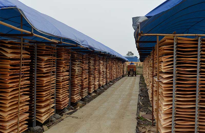 說(shuō)到旋切廠,不得不提到的是怪獸木業(yè)曬板場(chǎng)。300畝的曬板場(chǎng)滿滿的都是芯板,怪獸木業(yè)的曬板場(chǎng)不僅曬旋切廠刨出來(lái)的板材,更多的是各個(gè)供應(yīng)商提供的濕板材。每天的板材曬干收,收完再曬,重復(fù)使用無(wú)間斷。工人們每天早晚都要巡場(chǎng),巡場(chǎng)不只為了檢查板是否曬干,更重要的是在巡查中一遍遍地挑出那些不合格的二級(jí)、三級(jí)板,保證怪獸木業(yè)模板原料的高純正性。